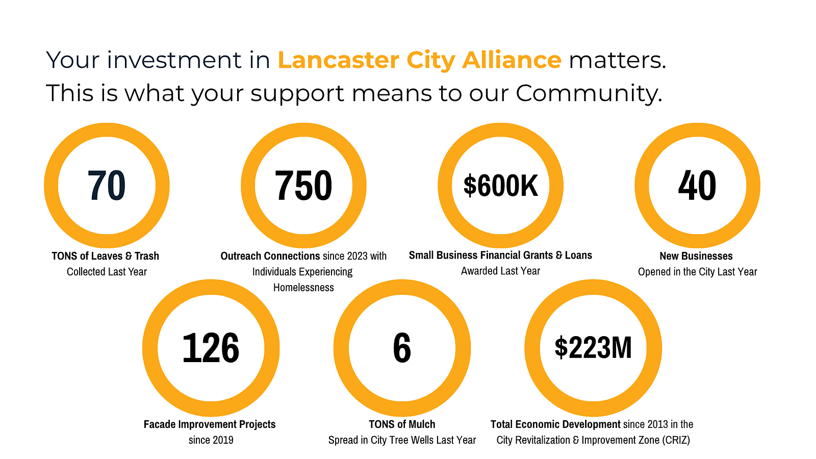 You are investing in the future of Lancaster City. Your support keeps our streets clean, safe, and welcoming for residents, businesses, and visitors. You empower local entrepreneurs, helping our small business community thrive and contribute to the vibrancy of our City. Your investment enhances public spaces, improving the quality of life for all who call Lancaster home. By fostering economic growth, you attract new businesses and create jobs that strengthen our local economy. Together, we champion resilient communities, providing outreach for homelessness and recovery services, ensuring Lancaster remains a place where everyone can flourish.
